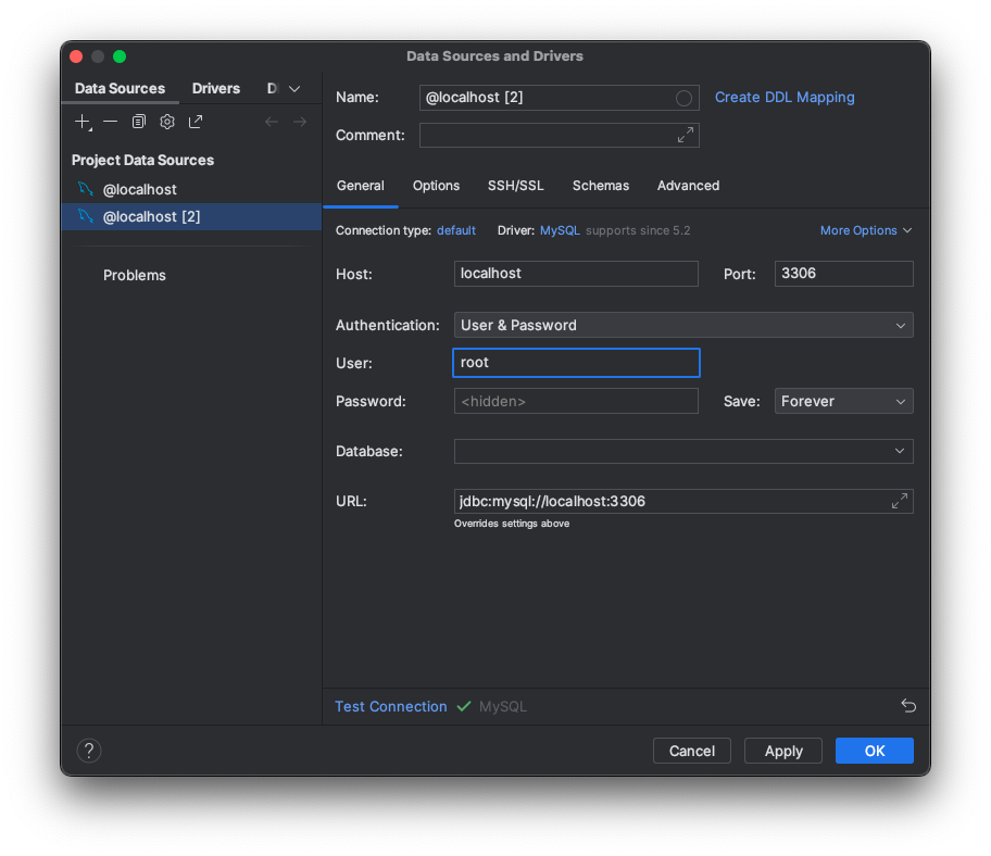 localhost – 접근하려는 mysql은 localhost에 있다.