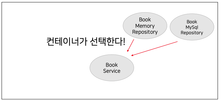 - 컨테이너가 선택해 BookService에 넣어주는 과정을 의존성 주입(DI, Dependency Injection)라고 한다.