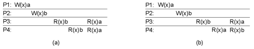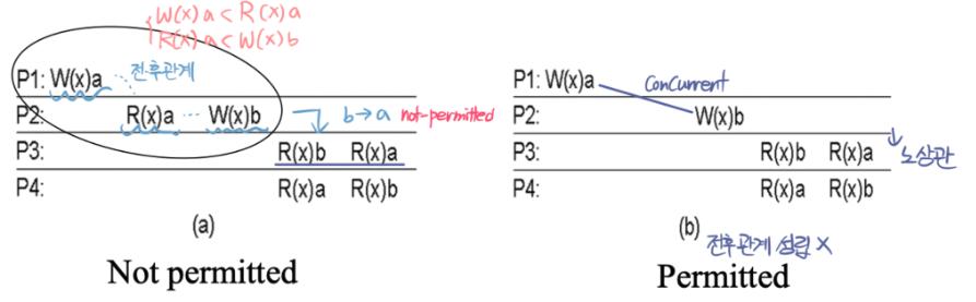 - 허용됨: 두 쓰기 작업 W(x)a와 W(x)b는 동시에 발생한 것으로 간주됨. → P에 따라 작업 순서를 다르게 인식할 수 있음.
