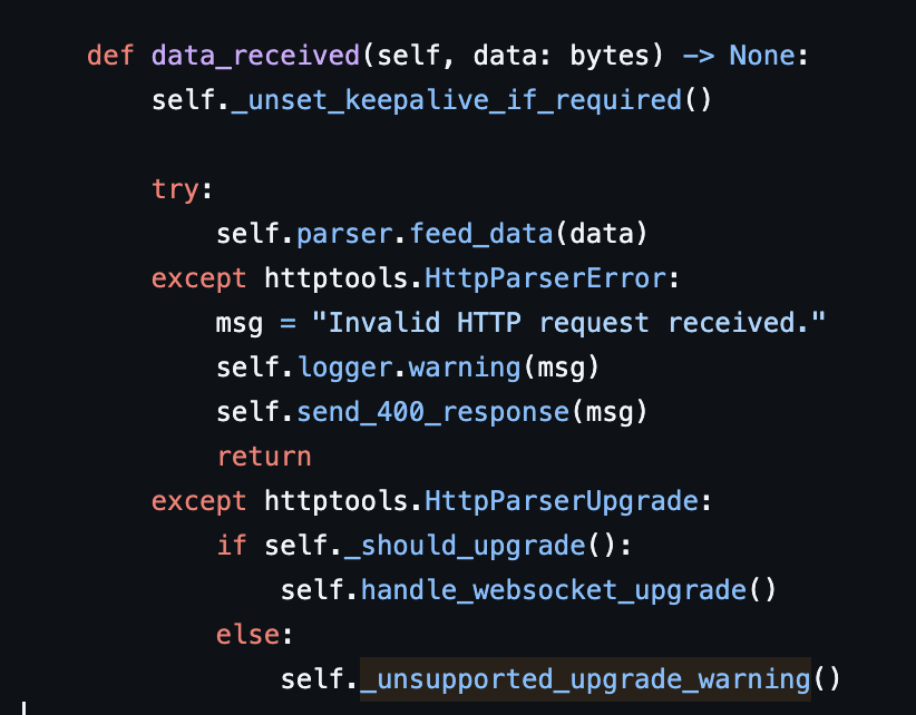 또한, parser.pyx에서는 should_upgrade 메서드가 llhttp_t 구조체의 upgrade 플래그를 확인하여 업그레이드 여부를 판단한다.
