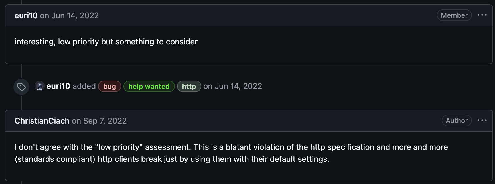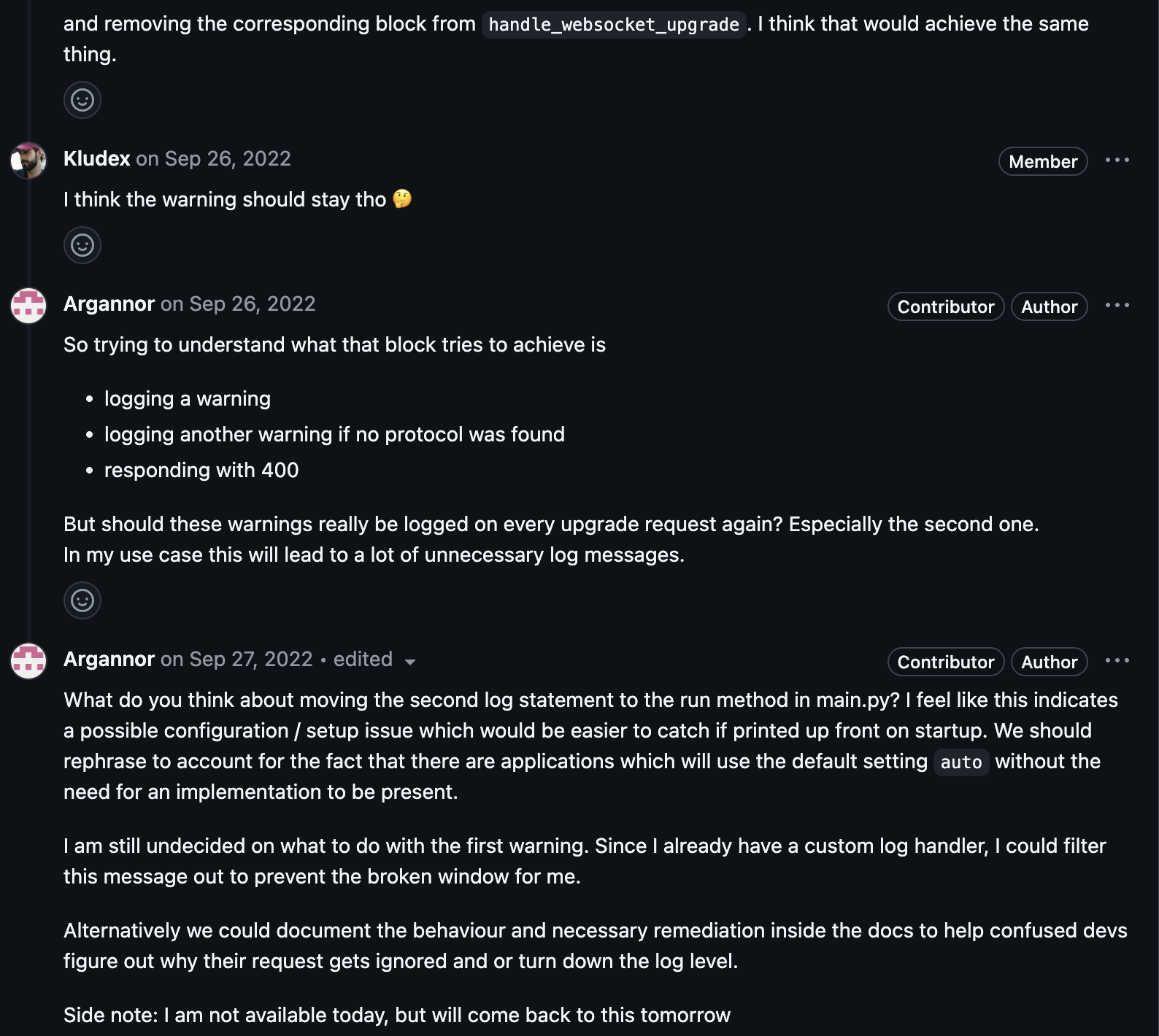이번 문제를 근본적으로 해결하려면 단순히 내 코드에서 해결할 수 있는 일이 아니었다. 결국 httptools의 파서 상태 처리 문제와 uvicorn의 구현 부족이 겹친 것이 원인이라고 판단했다. GitHub에 이슈를 올리고 개선 방향을 제시하는 과정을 통해 실제 커뮤니티에 기여하게 되었다. 생각보다 오픈소스 이슈는 활발히 관리되고 있었다. 첫 이슈 기여였고, 정말 100퍼센트 나의 문제 원인 파악이 맞는지 또한 아직 의구심이 들지만, 설령 틀렸더라도 또 거기서 전문가의 의견을 듣고 나누다보면 그 또한 성장하는 길일 것이다.