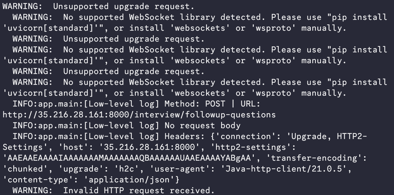 이러한 현상에 대해 FastAPI 서버의 로그를 확인해보니 다음과 같은 메시지가 표시되었다.