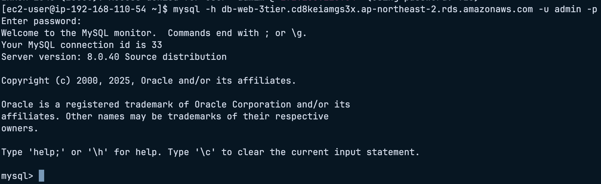 mysql -h {rds 엔드포인트} -u {admim} -p