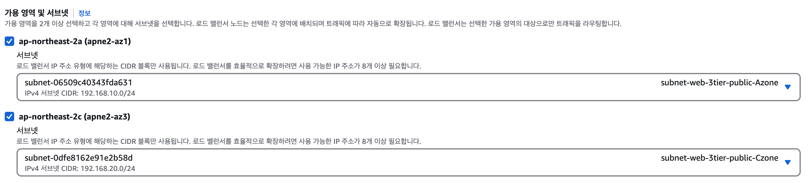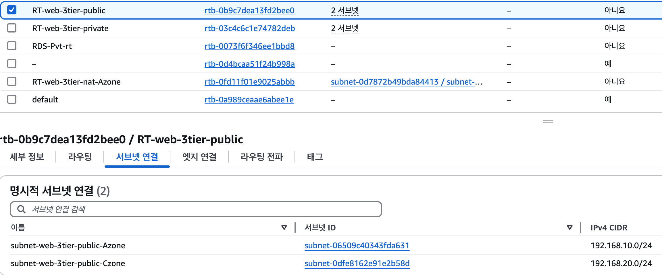 - 생성 후 subnet-web-3tier-public-Azone, subnet-web-3tier-public-Czone 서브넷 연결