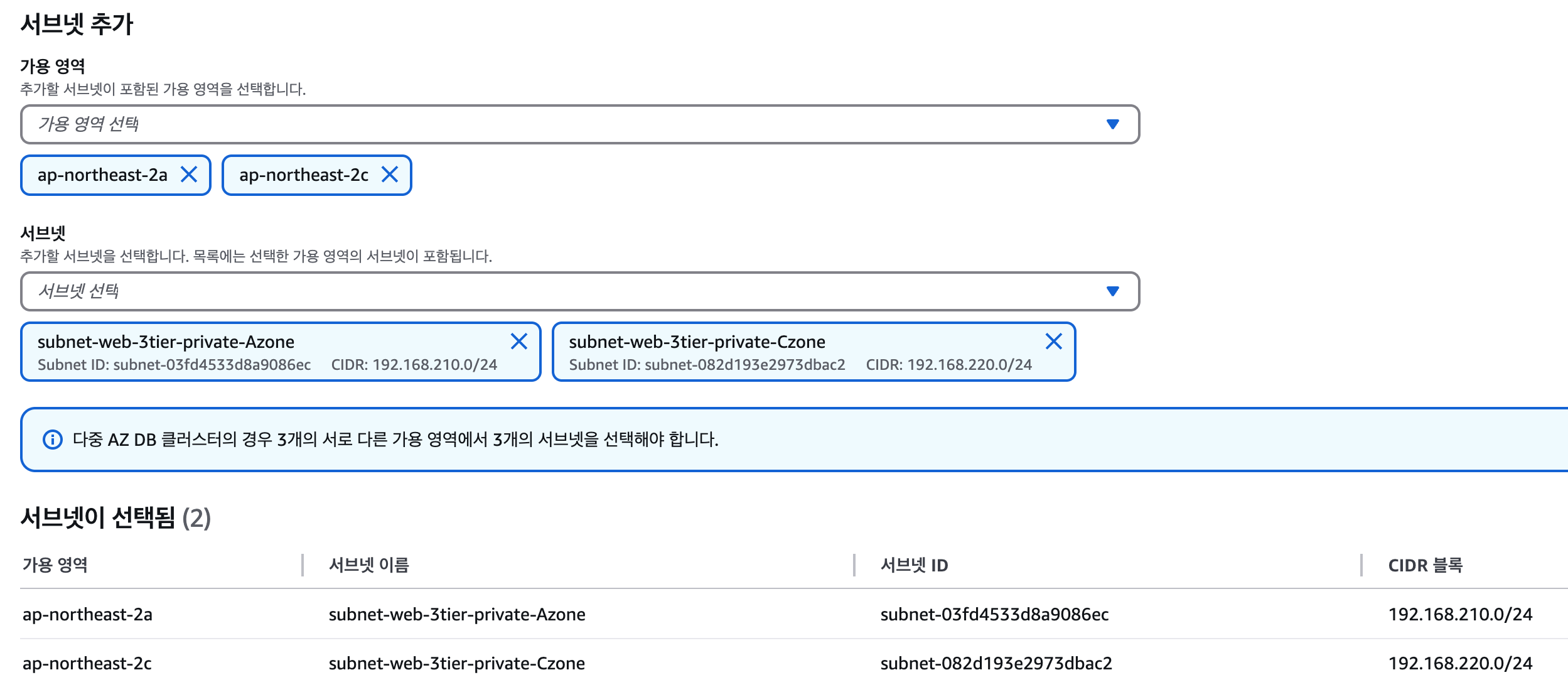 - 서브넷 선택: Private Subnet (AZone, CZone)
