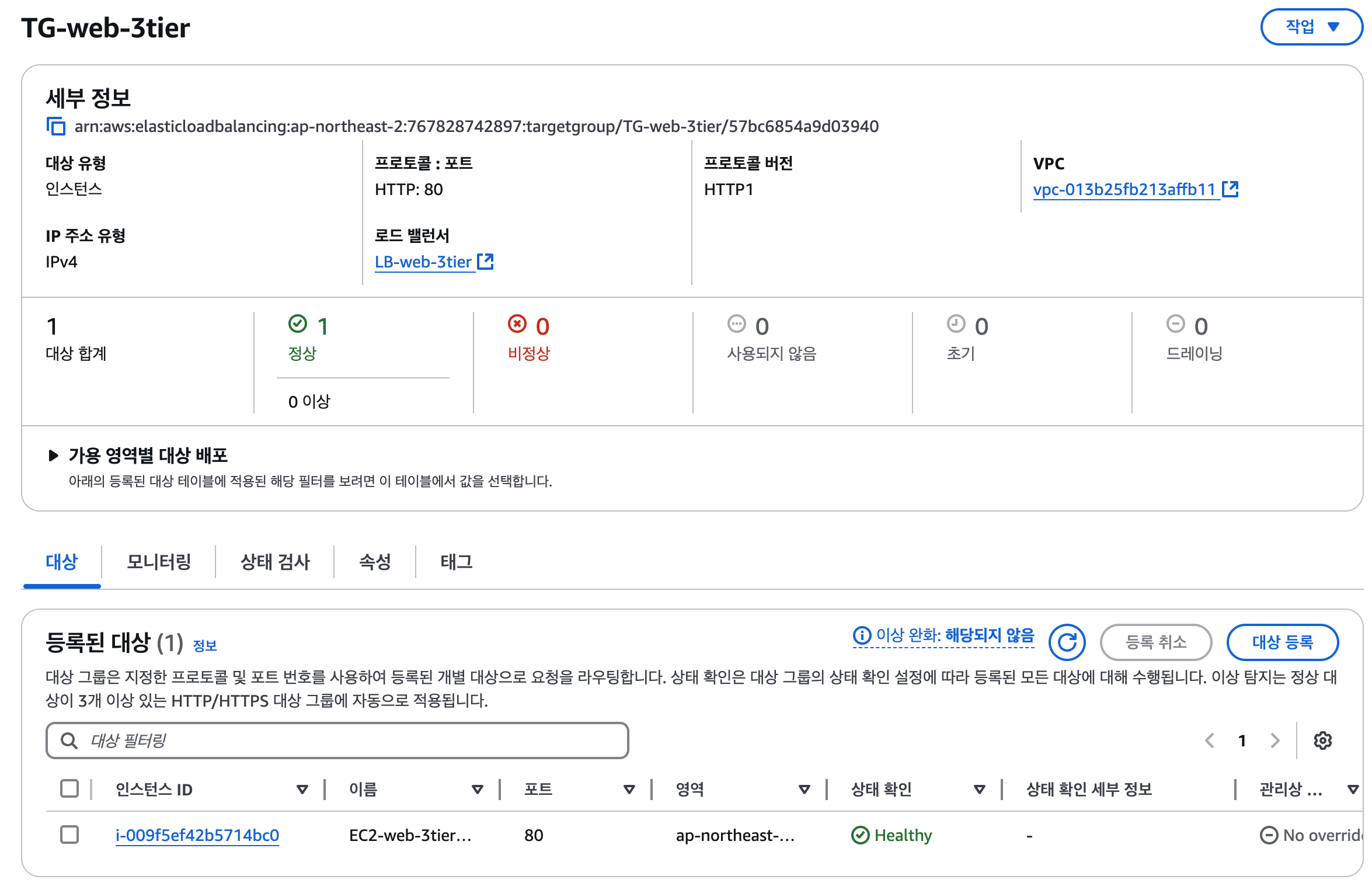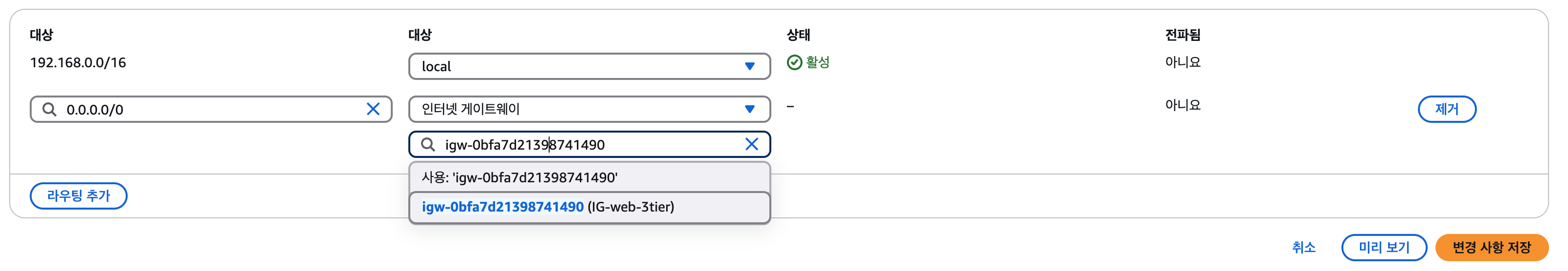 - 0.0.0.0/0 → 대상: 인터넷 게이트웨이 (IG-web-3tier) 추가
