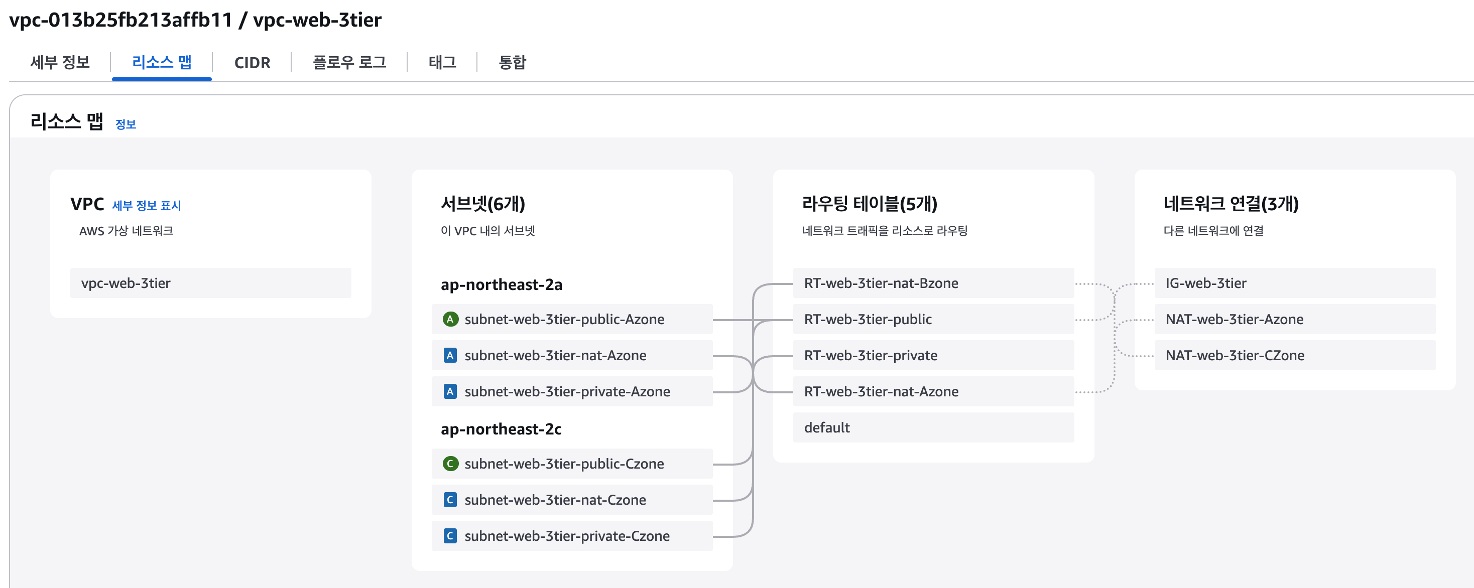 - 생성 후 subnet-web-3tier-private-Azone, subnet-web-3tier-private-Czone 서브넷 연결