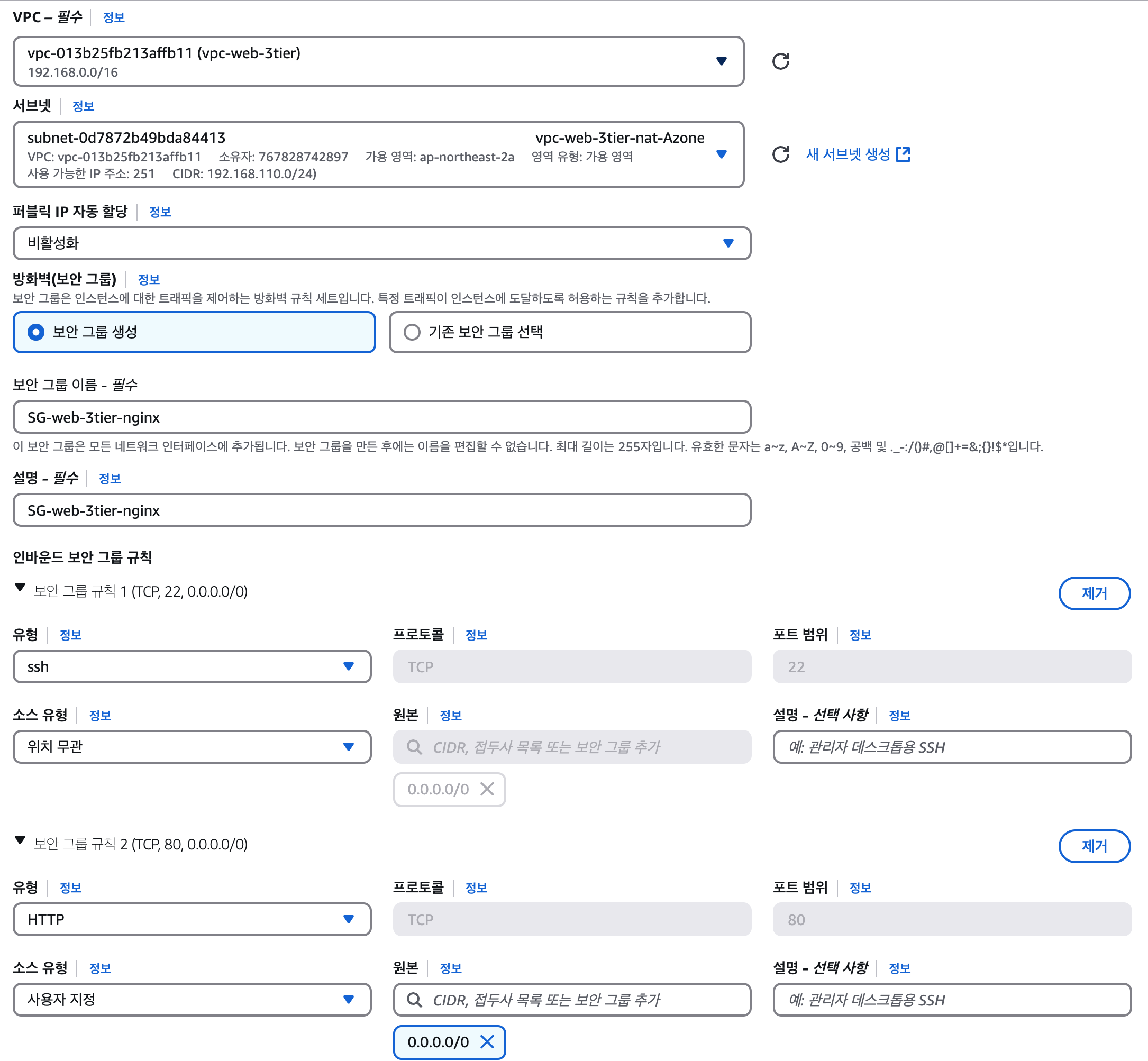 - 서브넷: subnet-web-3tier-public-Azone (192.168.10.0/24)