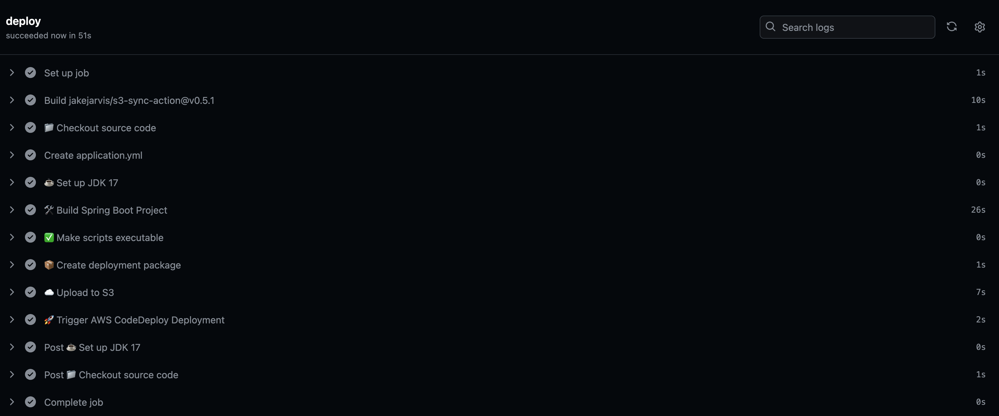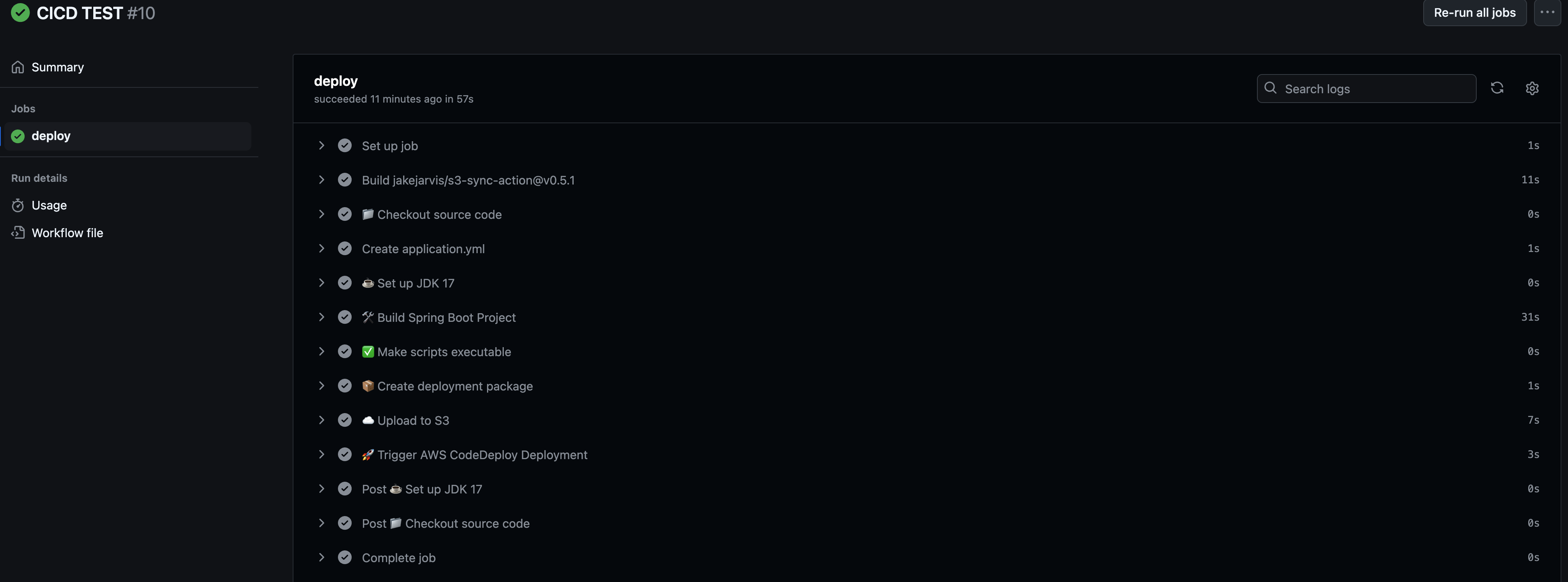 - GitHub Actions에서 .zip 생성 후 S3에 업로드, CodeDeploy로 배포 트리거