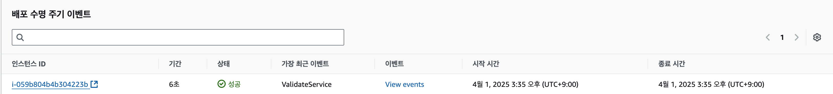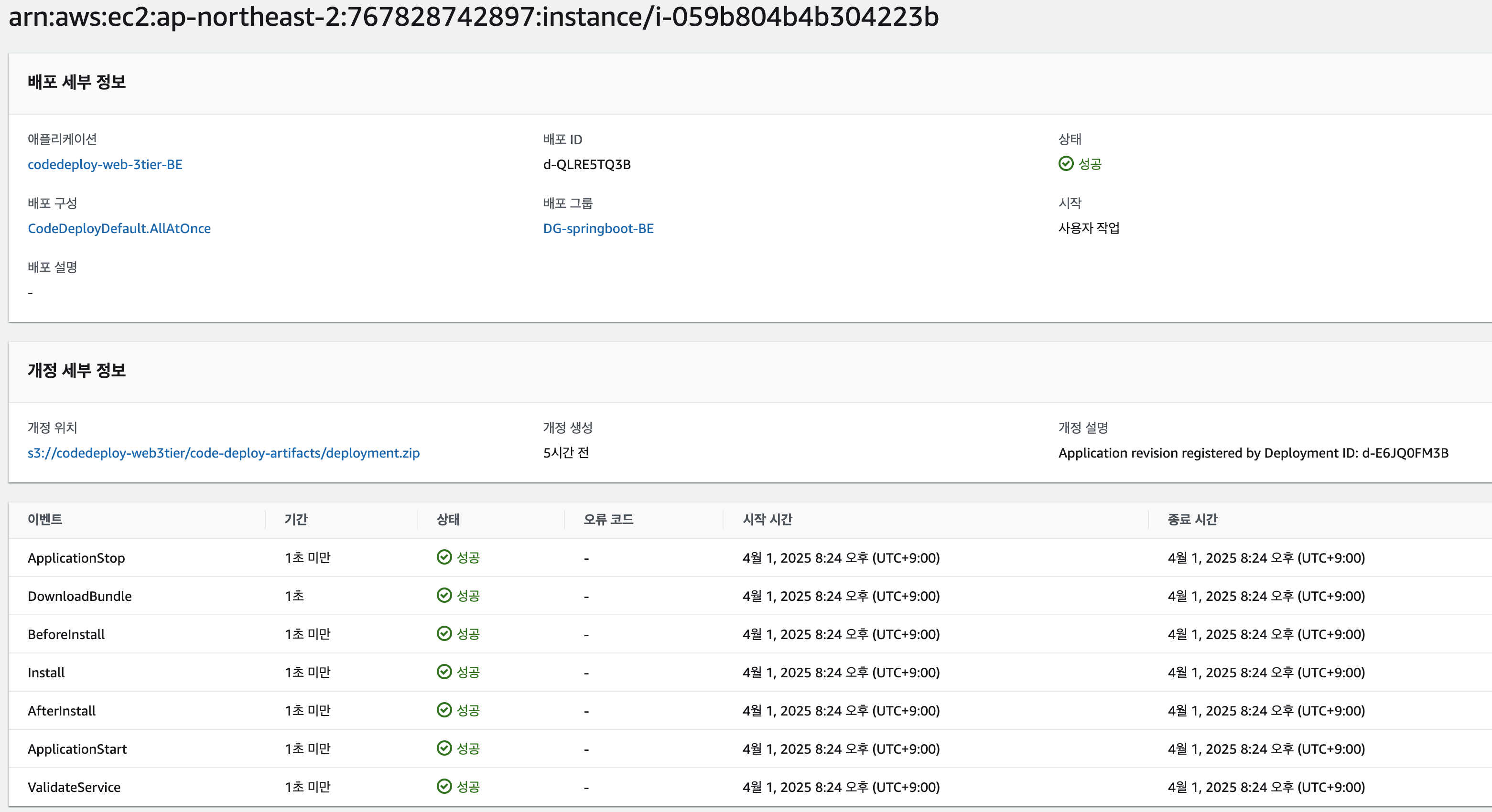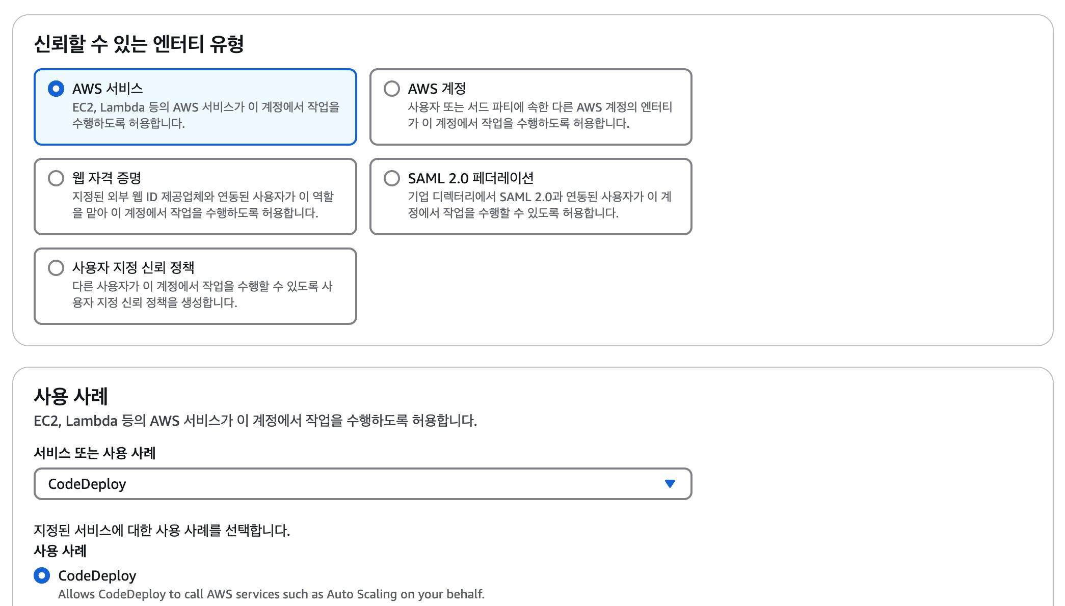 - CodeDeploy Application, Deployment Group, IAM 역할 연결 확인
