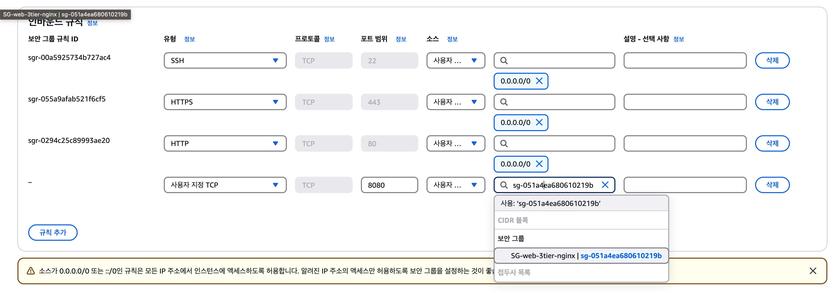 - 같은 보안 그룹을 사용하는 ALB가 EC2에게 요청을 보낼 수 있도록 허용.