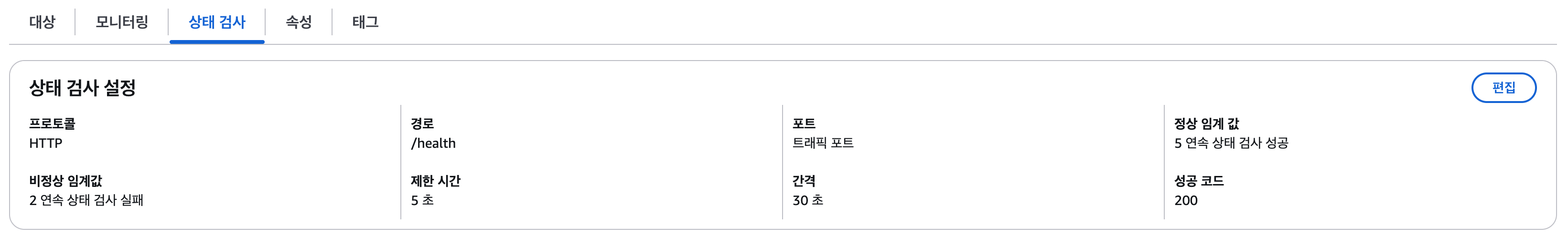 - Target Group의 헬스체크 경로가 Spring Boot에 맞게 설정